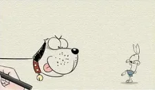 Сидел художник себе дома перед телевизором и рисовал разное, когда новый герой из-под его карандашей, кролик в синих шортиках, воспротивился буйным сценариям творца. Кролик оказался с характером, бойким и сильным, отчего художнику пришлось ввести против строптивца тяжёлую артиллерию в виде нарисованного бойцовского пса.
